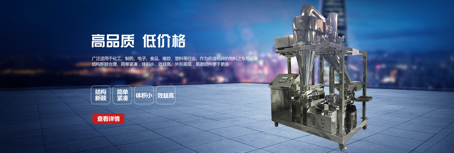 本公司生產的產品主要包括六大類:粉碎機系列、混合機系列、加料機系列、篩分機系列、制粒機系列和干燥機系列。生產的產品廣泛應用于化工、制藥、食品等行業,本公司生產的產品遠銷國內外,在國內外市場享有盛譽,贏得用戶的青睞與好評